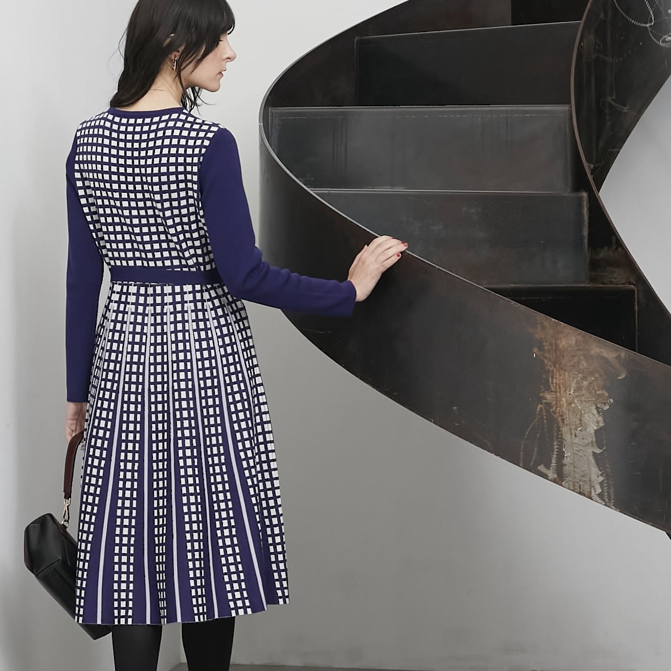 毎年人気のジャガード編みワンピース。今年はウィンドウ・ペンチェック柄です。