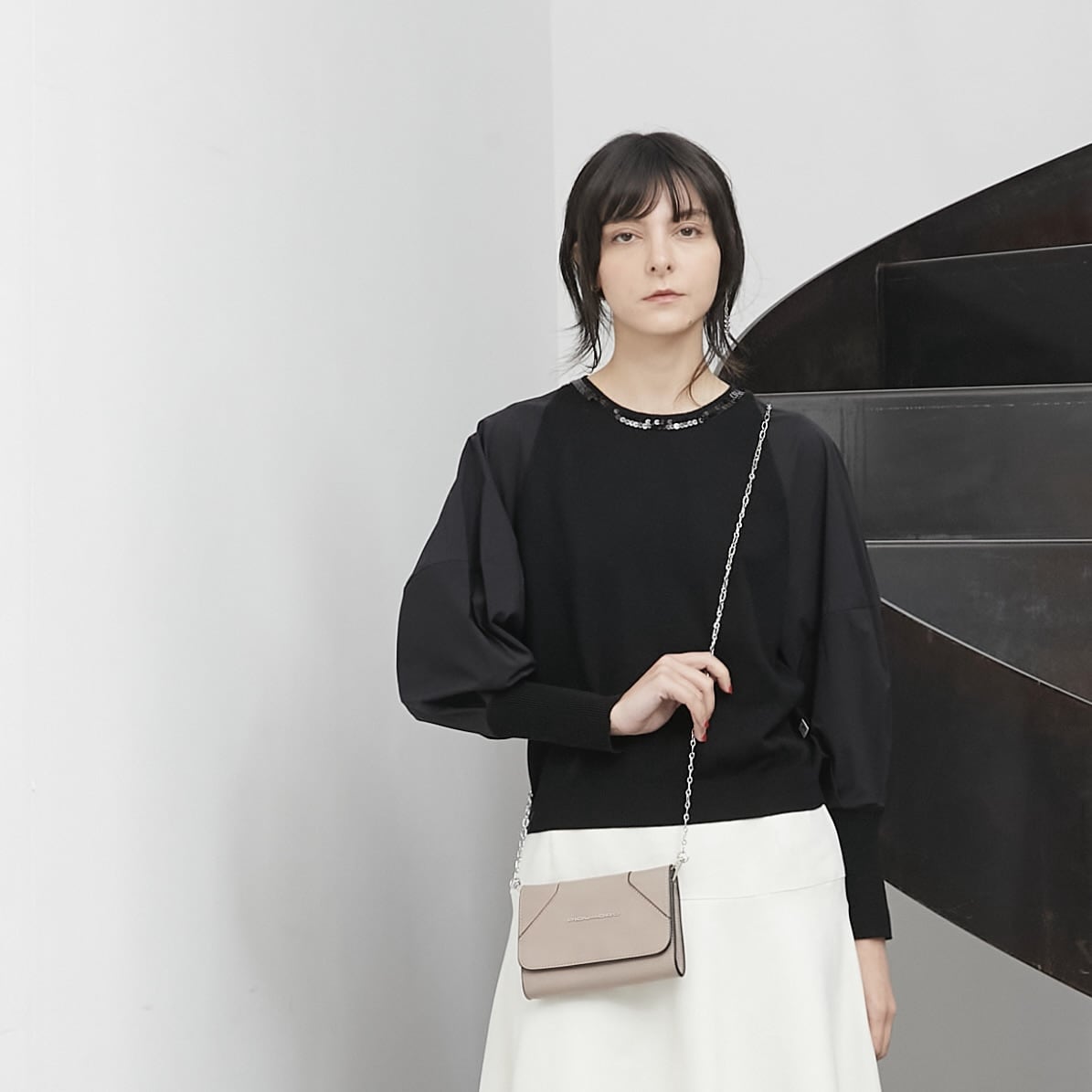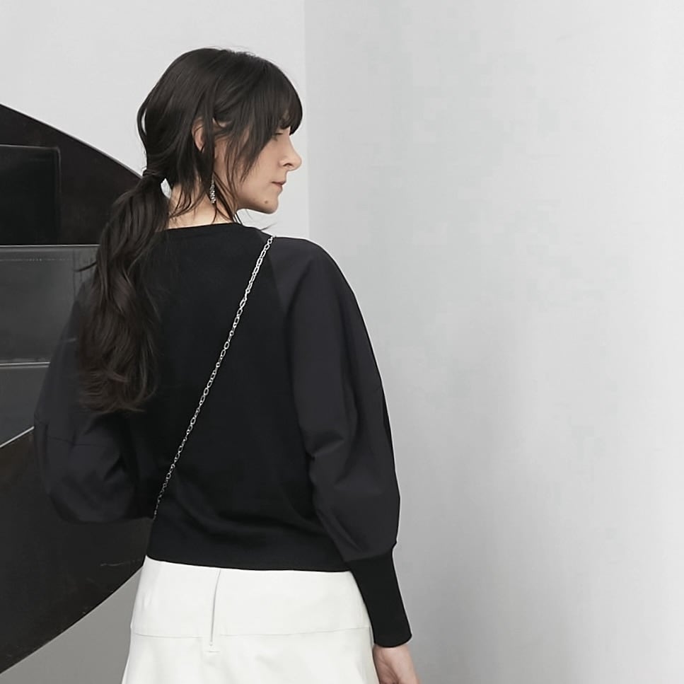 ランタン型の袖部分に布帛生地を使用した、異素材ドッキングプルオーバー。