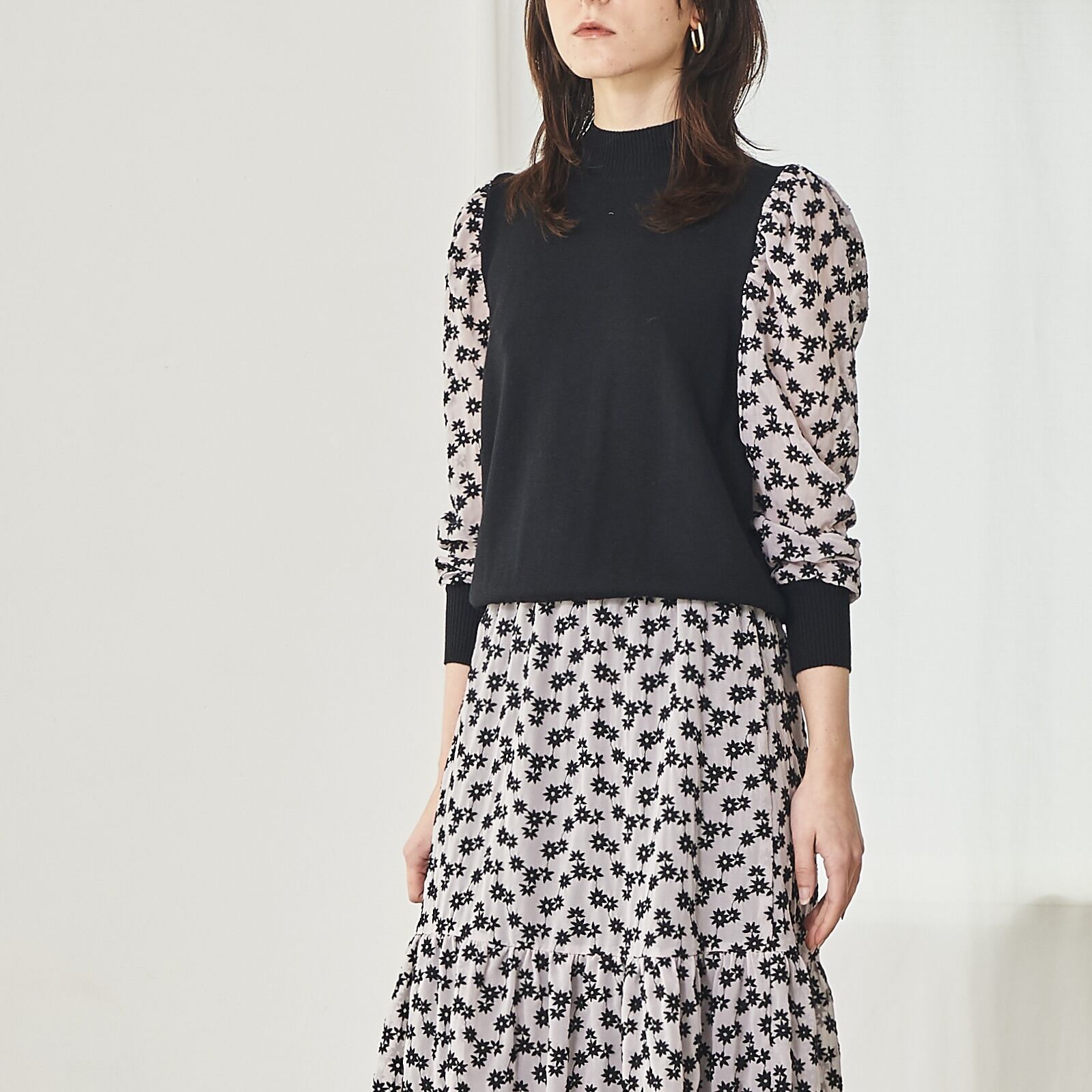 立体的な刺繍が施された生地を、袖部分に使用したニット。