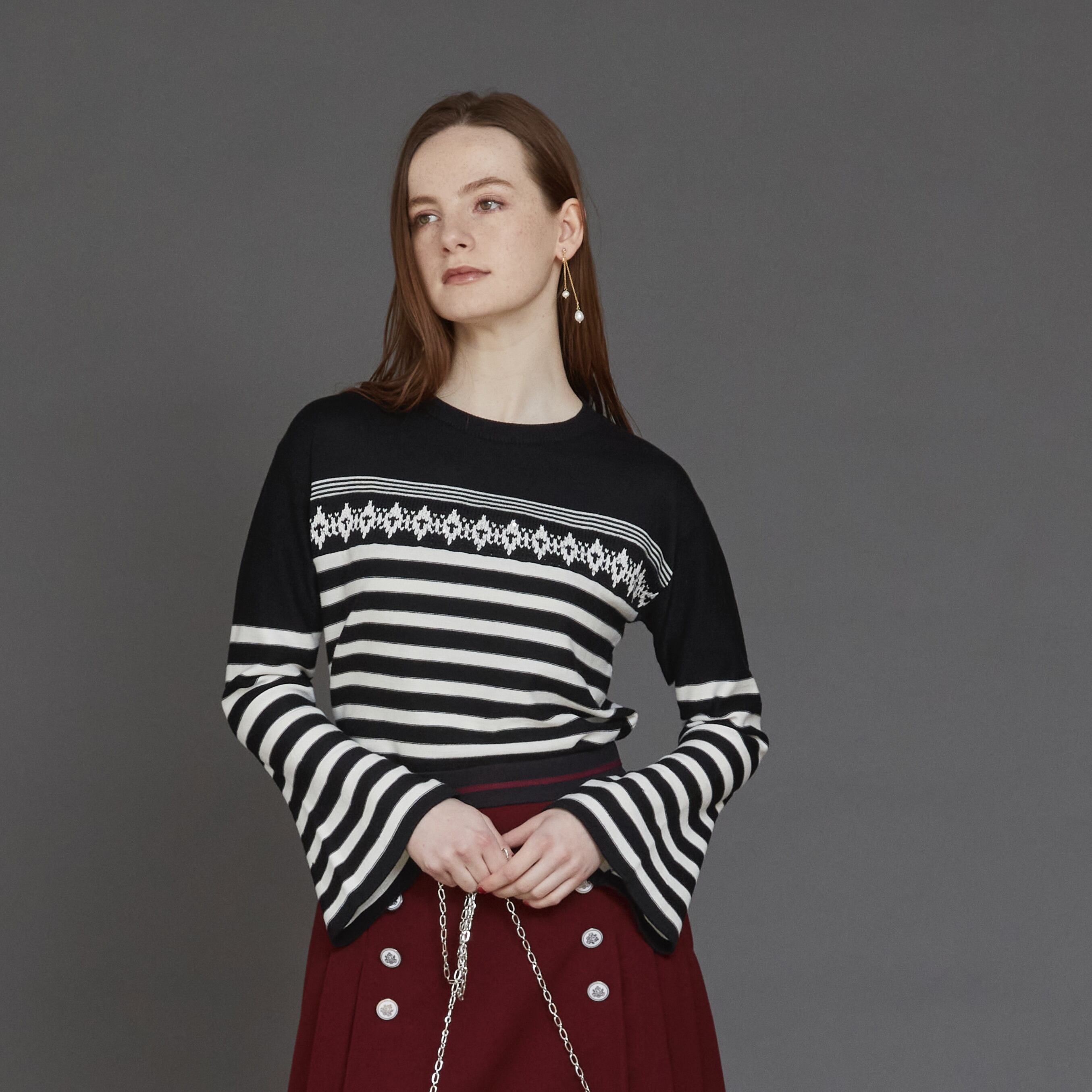 ペプラム袖が印象的なボーダーニット。